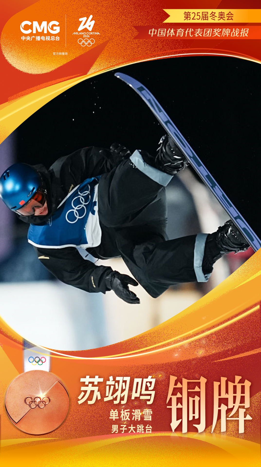 当地时间7日晚,中国选手苏翊鸣获得米兰冬奥会单板滑雪大跳台铜牌。